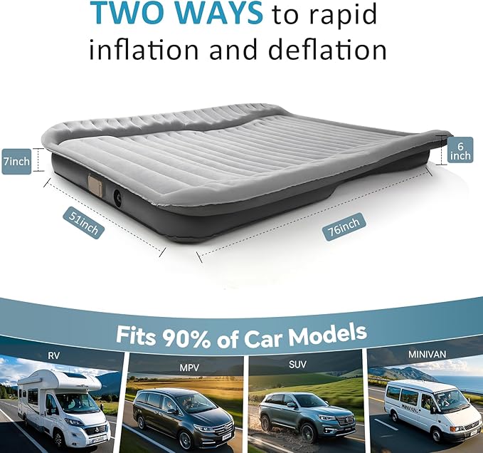 - 【Multi-functional Air Mattress】 Featuring a self-inflating design, the car mattress is easy to pack and unfold. Whether in your SUV, RV, truck, or set up in your living room or at a campsite, this air mattress adapts seamlessly to your needs