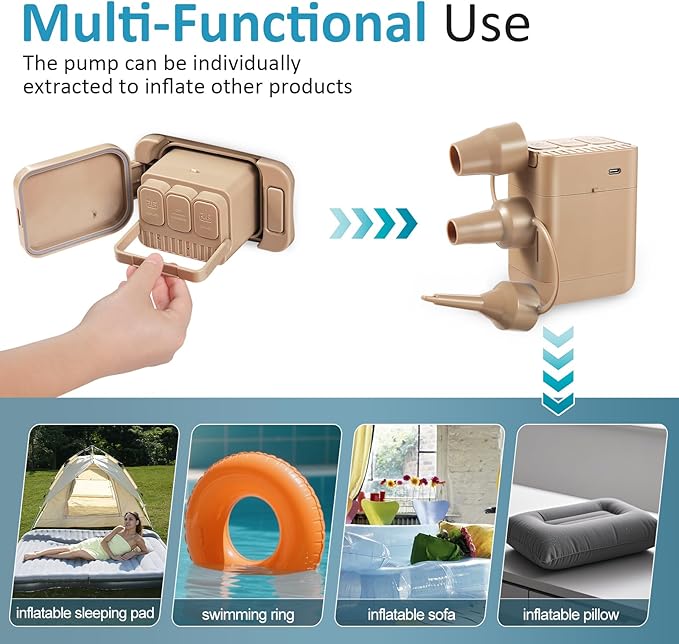 - 【Easy, Quick, and Hassle-free】This car camping mattress features an upgraded Built-in Removable Pump. With just a single press, it achieves quick inflation in just 1.5 minutes. Once fully charged, it can inflate up to 8 times