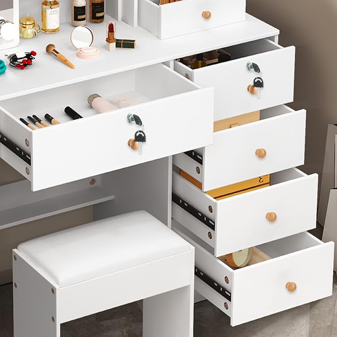 - ๐ใ๐๐๐ซ๐ ๐ ๐๐๐ฉ๐๐๐ข๐ญ๐ฒใThis makeup vanity is divided into three functional areas with reasonable partitioning and storage. The large vanity table top is for your handy items, the open shelf allows you to keep your daily skincare products at hand, and the 5 large-capacity drawers are enough to hold your masks, jewelry, cosmetics, lipsticks, etc.