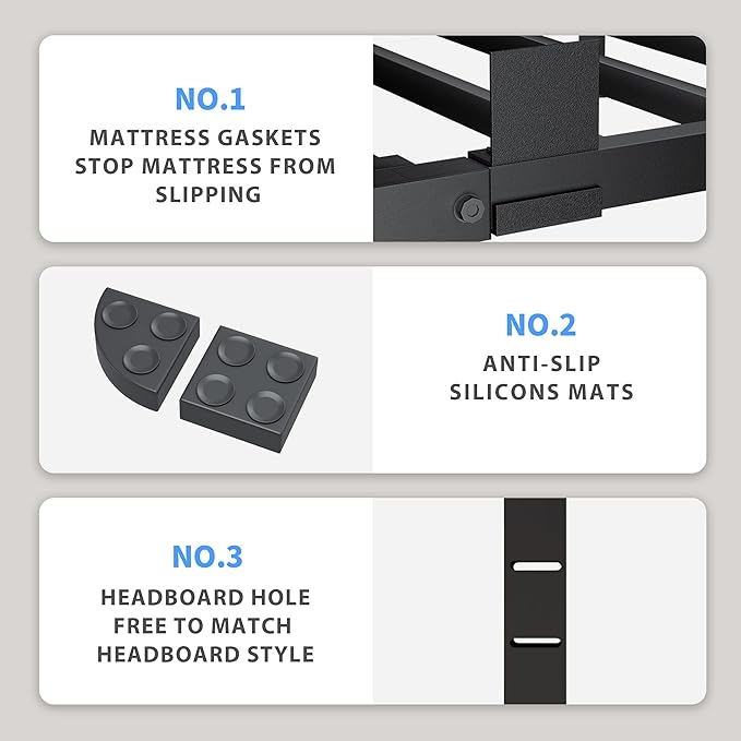 - 4 MATTRESS STOPPERS: The bed frame comes with 4 mattress stoppers that secure the mattress to prevent sliding