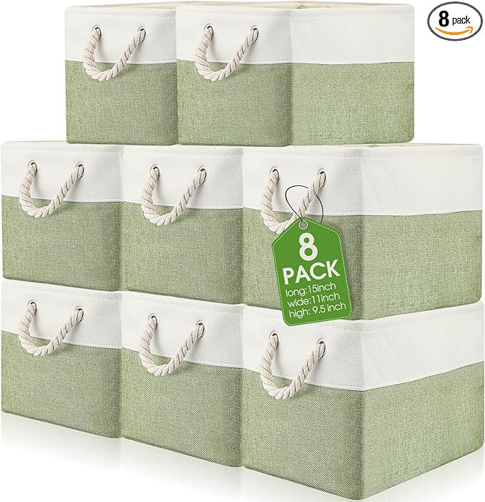 meekoo 8 Pack Collapsible Storage Bins Fabric Storage Bins Polyester Fabric Baskets with Handles Linen Closet Organizer for Shelf Home Closet Towels Toys(15 x 11 x 9.5 in,Green White)