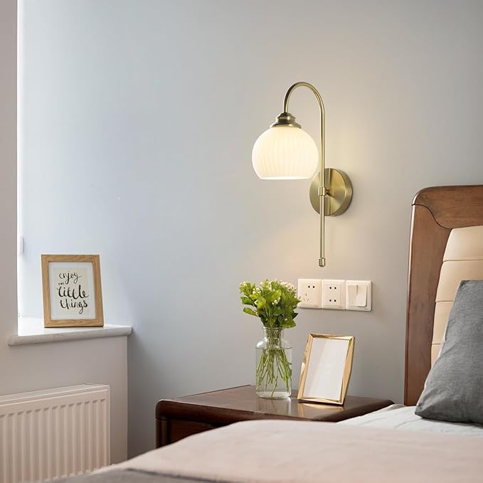 - Antique Brass Sconces with Ribbed Glass Lampshade: The bathroom wall mounted light sconce is made of brushed finish arc metal lamp body and milk glass, the white glass lampshade is not normal smooth glass, it’s ribbed glass, which is more attractive than ordinary glass, and emitting a warm and romantic light, to create a romantic home atmosphere. Unique arc design and ribbed glass shade sparkle to your interior