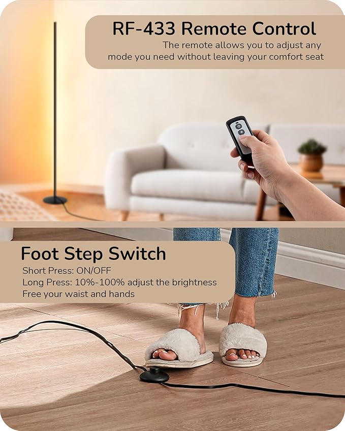 - [RF-433 Remote Control] The RF-433 remote control can effortlessly control the minimalist floor lamp from 49 feet away, allowing you to choose between 7 brightness levels. With just one click, you can switch to the night light mode, which is 30% brightness of normal, and the memory feature can remember your last setting