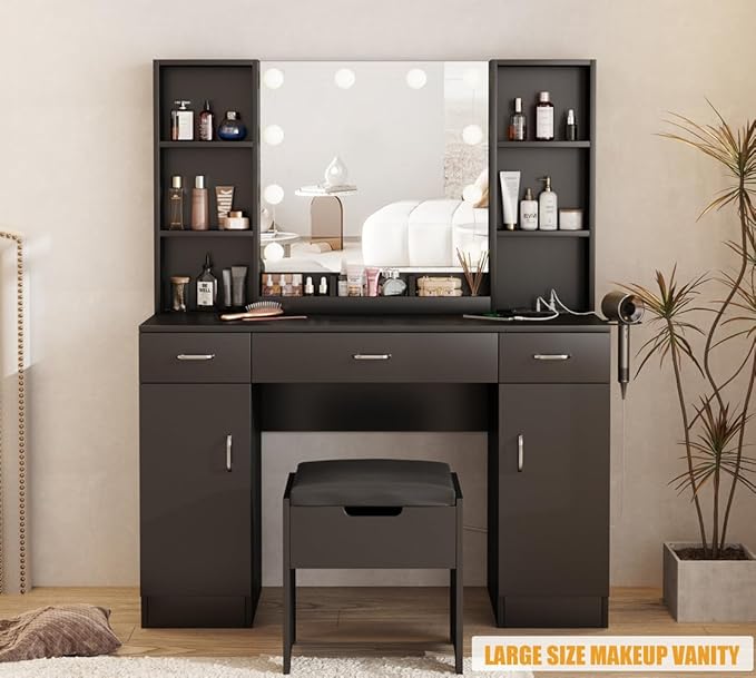 - [Beautiful & Practical Make up Vanity Station] Elegant black vanity desk, perfect combination of vanity & cabinet, can match perfectly with other furnitures in your bedroom and dressing room, also perfect for beauty salons, spas and photography studios.