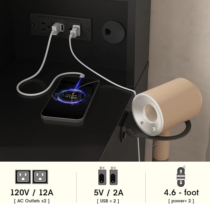 - šćBuilt-in Charging Station & Hair Dryer RackćThe vanity desk with chair upgraded design with convenient hair dryer rack and power outlet. This vanity table add 2 standard plug sockets and 2 USB ports, you can easily use hair dryer, curling iron in front the mirror, and charge your phone or other mobile devices during makeup. Nice vanity set for dressing room, salon or live broadcast.
