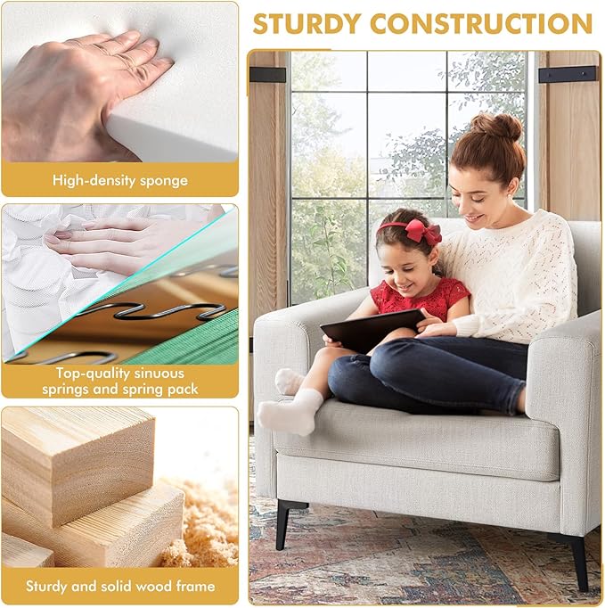 - ✔【Premium Material】upholstery and front-edge wood trim , solid wood frame with concealed stabilizing feet; performance linen fabric upholstery and front-edge wood trim, suspension for long lasting comfort and support ,The maximum load capacity of this product is 350LBS.