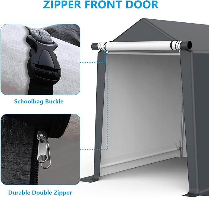 - 【Multi-Use 6x8ft Heavy-Duty Carport】 6x8ft carport fits motorcycles, boats, and even bike storage—ideal for rural storage needs. The zippered door add adaptability, making it a versatile solution for both storage and outdoor events.