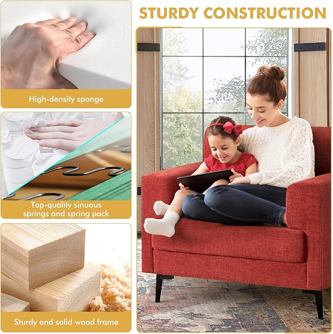 - ✔【Premium Material】upholstery and front-edge wood trim , solid wood frame with concealed stabilizing feet; performance linen fabric upholstery and front-edge wood trim, suspension for long lasting comfort and support ,The maximum load capacity of this product is 350LBS.
