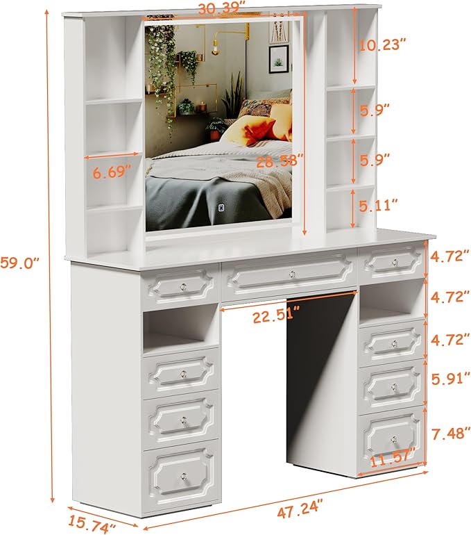 - đăAdequate storage spaceăEquipped with 9 drawers and 10 open shelves, this vanity desk provides ample storage for all your beauty essentials. It features two shelves conveniently placed between the drawers, perfect for storing makeup bags, curling irons, hair dryers, and more. Keep your brushes, palettes, jewelry, and cosmetics organized and easily accessible. Additionally, the expansive desktop offers plenty of room for comfortable makeup application.