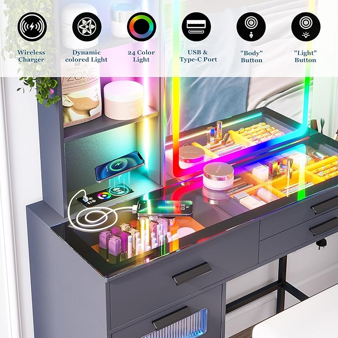 RGB Vanity Desk with Sliding Mirror and Lights, LED Makeup Vanity with Charging Station/Motion Sensor Light, Glass Top Dressing Table Set with Jewelry Box,6 Drawers,Stool for Bedroom(Grey)