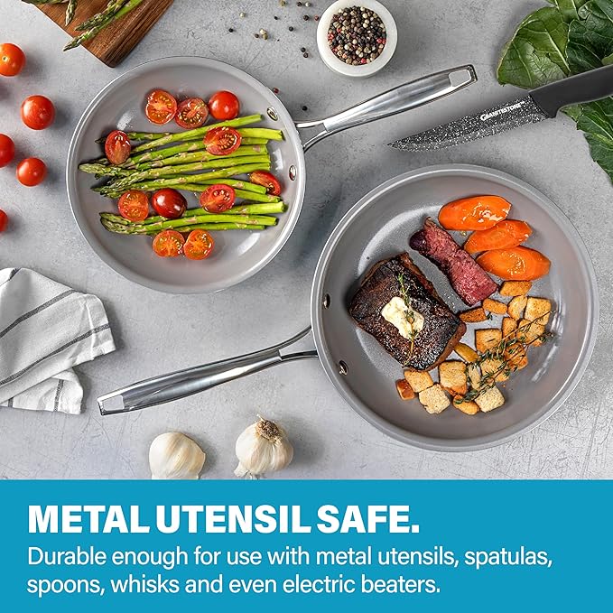 - METAL UTENSIL SAFE: The Gotham Steel ceramic cookware set nonstick surface is infused with diamond like particles, the strongest material on earth which makes it durable enough to withstand metal utensils, spatulas, spoons, whisks and even electric beaters while delivering years of outstanding, nonstick use.