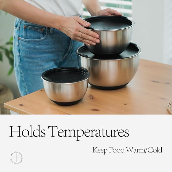 - Versatile Mixing Bowl Set: This stainless steel bowl set is designed for various kitchen tasks, from whipping up a batch of cookies to tossing a vibrant salad. With a range of sizes, these bowls are great for meal prep, baking, and serving. Say goodbye to flimsy alternatives and upgrade to these reliable stainless mixing bowls.
