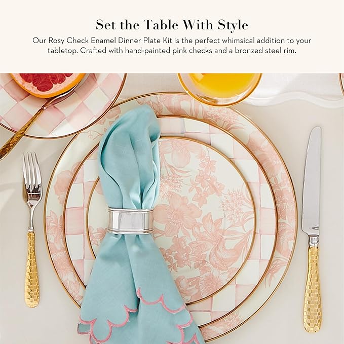 - ELEGANT SERVING ESSENTIAL: Our pretty Rosy Check plate is made with heavy-gauge steel and features pink-and-white checks and a bronzed stainless-steel rim. It’s a great addition to holiday dinnerware or an everyday dish set.