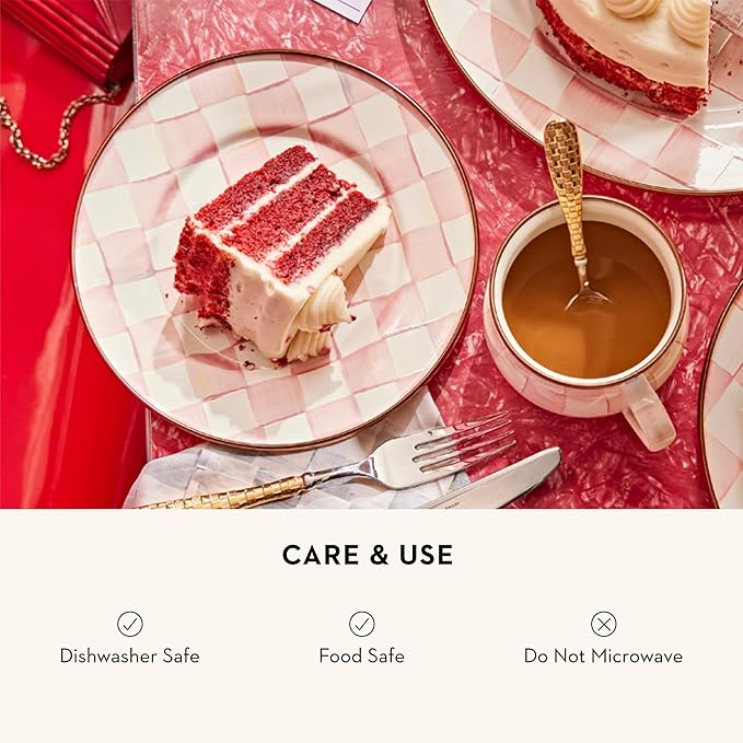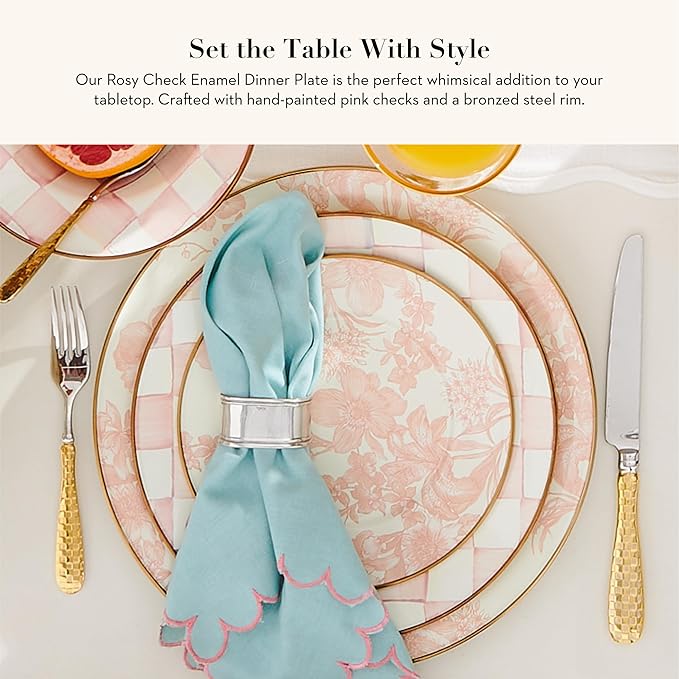 - ELEGANT SERVING ESSENTIAL: Our pretty Rosy Check plate is made with heavy-gauge steel and features pink-and-white checks and a bronzed stainless-steel rim. It’s a great addition to holiday dinnerware or an everyday dish set.