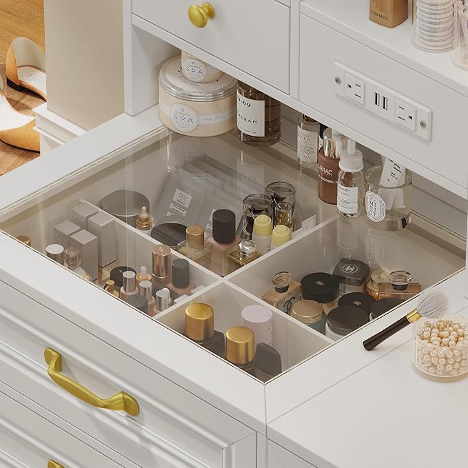 - 【Makeup Vanities with Charging Station】The built-in plug has 2 AC outlets & 2 USB ports. Charge your phone, tablet, or any device right at your vanity. Say goodbye to the hassle of finding outlets, and hello to convenience!