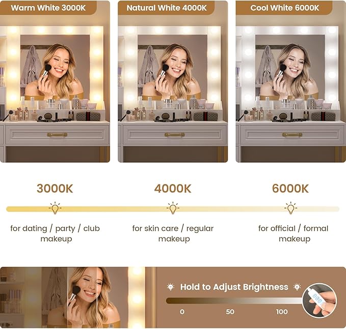 - 【Vanity Desk with 10 Hollywood Lights】10 (yes, TEN!) Hollywood lights around your mirror, giving you that perfect glow for makeup, selfies, and everything in between. A HUGE mirror so you can check out your outfit and makeup from every angle. No more squinting into tiny mirrors