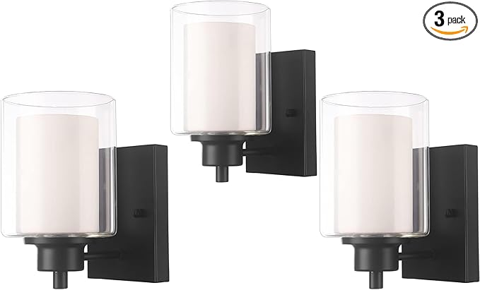 3 Pack Bath Vanity Light Fixtures 1-Light, Indoor Black Wall Light with Dual Glass Shade, Farmhouse Bathroom Wall Scone