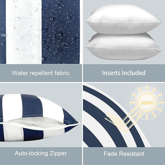 - đŚď¸ ăALL WEATHER USEă: These outdoor throw pillows are made of durable polyester fabric and soft PP cotton. Itâs water repellent, fade-resistant and anti-pilling. Wonât fading under the direct sunlight over 500 hours. The insert is filled with soft PP cotton, overstuffed construction for enhanced comfort and longevity. This fluffy accent pillow measures up multiple use conditions, like patio furniture sofa, garden, coach and bedroom.
