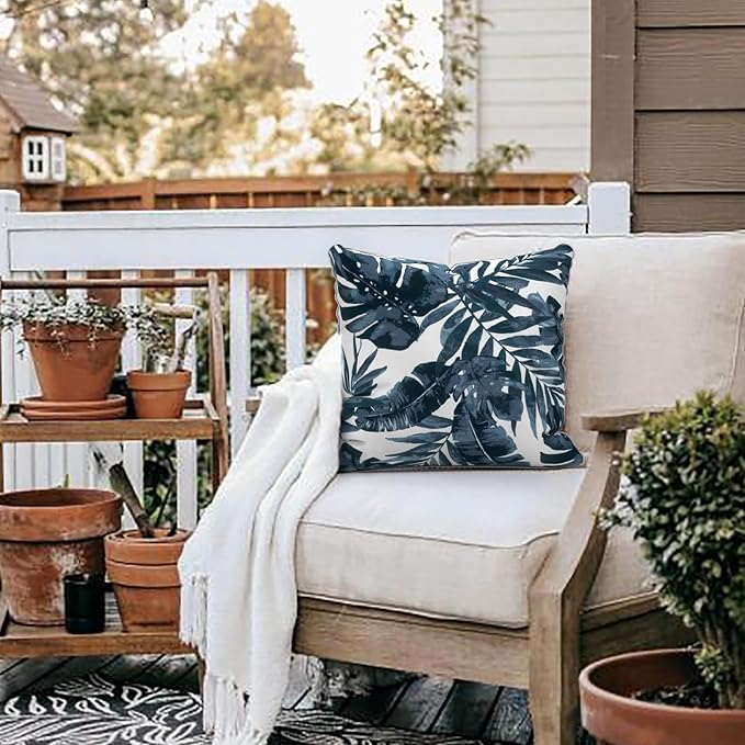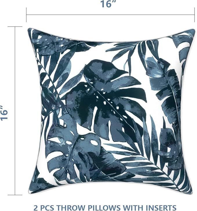 LVTXIII Set of 2 Patio Throw Pillows Waterproof 16"x16" Fade Resistant Outdoor Throw Pillows with Inserts, Fluffy Decorative Garden Toss Pillow Cushions for Home Patio Coach Sofa Use, Palms Blue