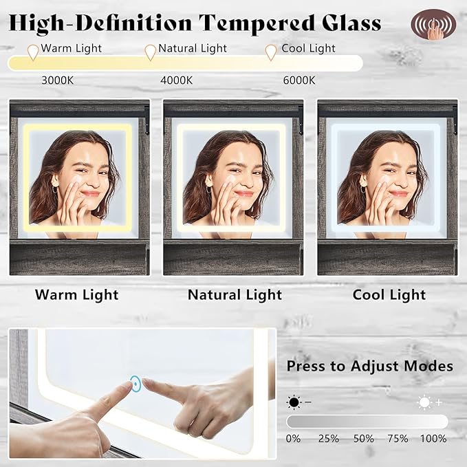 - 【SLIDING HD MIRROR WITH LED LIGHTS】 Adjustable LED lights for flawless makeup and skincare routines. Choose from cool white, warm white, or natural light which can be pushed to both sides to meet your grooming preferences.