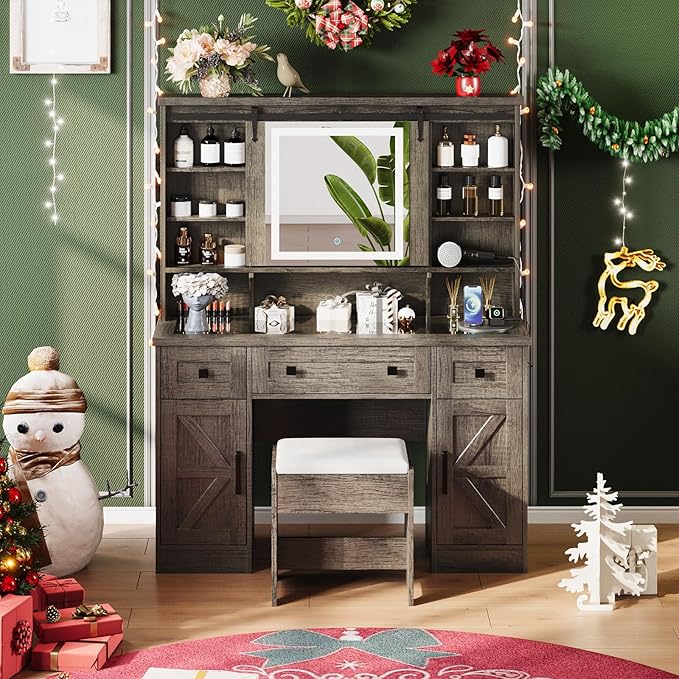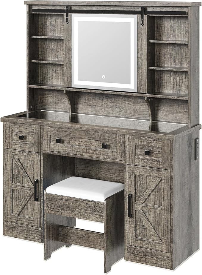 - [Big Farmhouse Vanity Desk] Overall Measuring: 47.2''W*15.7''D*58.5''H, natural 3D rustic oak wood grain, sliding HD mirror & glass visible tabletop & barn-door decor design add farmhouse charm & elegance, charging station & upholstered stool add refinement & practicality