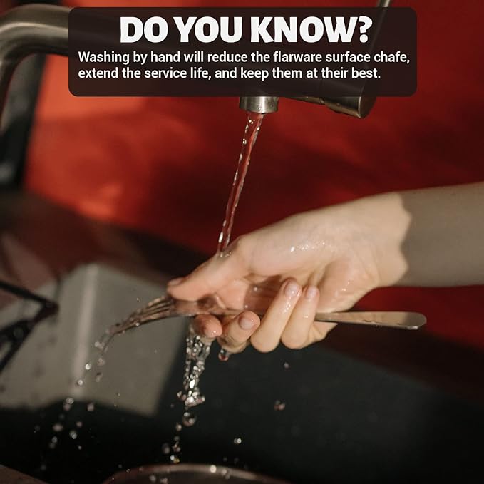 - Tips: Satin flatware never needs polishing. Hand wash recommended, dry them before storing to prevent water spots or potential corrosion. Do not use steel wire brush, hard sponge,cleaning cloth or any other hard-material cleaning tools for cleaning to avoid damage to the silverware
