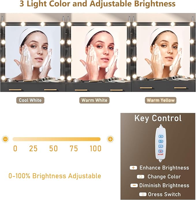 - [Power Outlet and Light Bulbs] The Built-in power outlet includes 2 standard outlets and 2 USB ports, which can provide power for your hair dryer, curling iron, and mobile phone. 10 light bulbs with 3 light settings: cool white (for formal makeup), warm white (for skin care or daily makeup), and warm yellow (for dinner or party makeup). Press the switch to adjust the brightness.