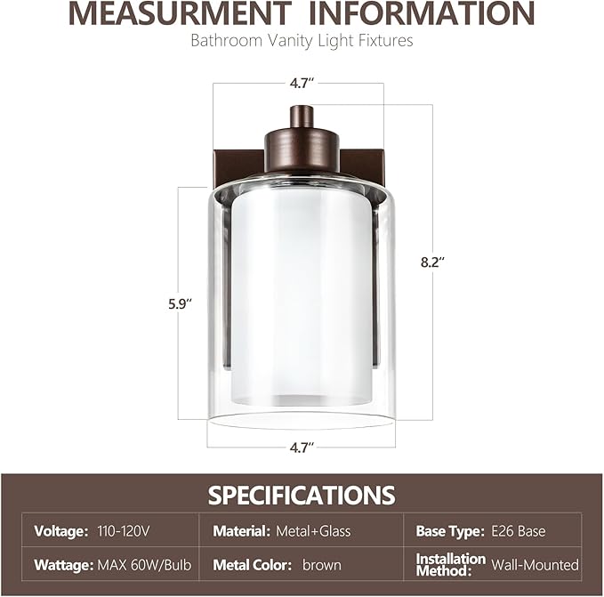 - Unique Design: This wall vanity light fixture is made of a sturdy metal lamp body and dual glass. The mid-century or modern design is highly suited for any decoration style, ideal for the top side of a mirror or bed, a doorway or entryway, lining an office or hotel hallway, or under a covered porch