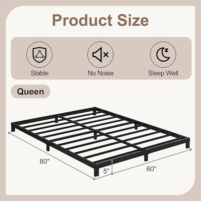 5 Inch Low Queen Bed Frame, Heavy Duty Bed Frame Queen Size Low Profile, No Box Spring Needed, Easy Assembly, Noise Free, Black