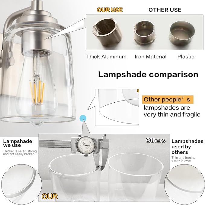 - 3.【LONG LASTING & DURABL】Solid thick glass lampshade,this vintage bathroom light features a robust all-aluminum construction, including a aluminum securing ring that firmly holds the glass shade.Advanced electroplate craft,and sealing technology. Anti-corrosion and moisture-proof, great for humid spaces like bathrooms.