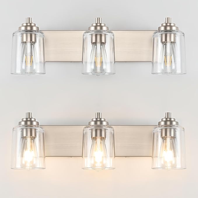 - 1.【EASY TO INSTALL】15-Minutes Easy Installation, hardwired, attach the globe to the light only, USA standard back plate. This bathroom light fixtures over mirror 3 lights brushed nickel directly connects to the reserved wire and then mounts to the wall.