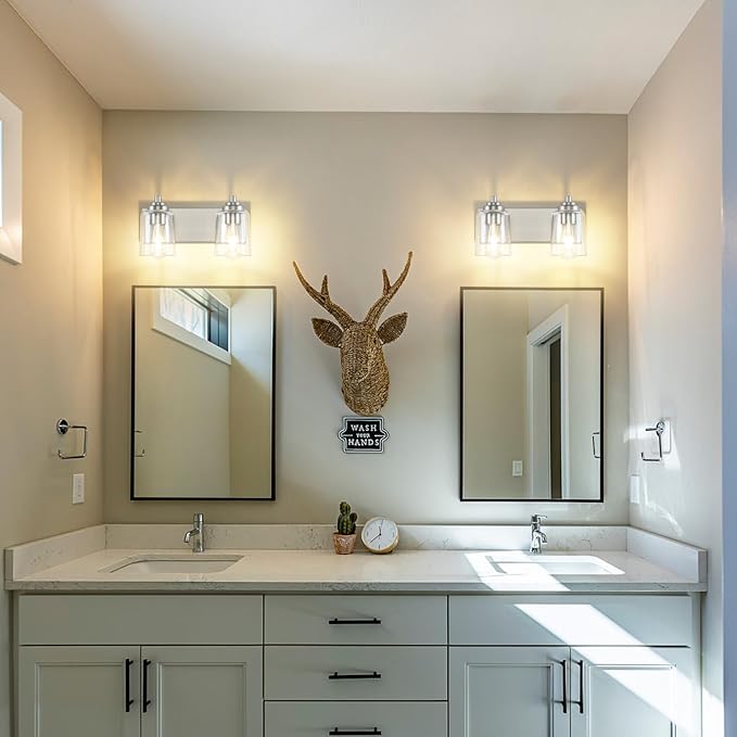 - 3.【LONG LASTING & DURABL】Solid thick glass lampshade,this vintage bathroom light features a robust all-aluminum construction, including a aluminum securing ring that firmly holds the glass shade.Advanced electroplate craft,and sealing technology. Anti-corrosion and moisture-proof, great for humid spaces like bathrooms.
