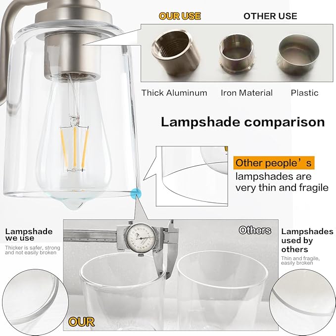 - 3.【LONG LASTING & DURABL】Solid thick glass lampshade,this vintage bathroom light features a robust all-aluminum construction, including a aluminum securing ring that firmly holds the glass shade.Advanced electroplate craft,and sealing technology. Anti-corrosion and moisture-proof, great for humid spaces like bathrooms.