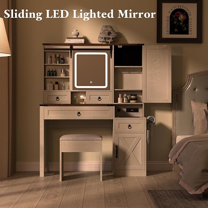 Farmhouse Makeup Vanity Desk with Sliding Mirror and Lights, 42" Glass Top White Vanity Set with Charging Station & 4 Drawers & 2 Cabinets, Dressing Table with Stool for Bedroom