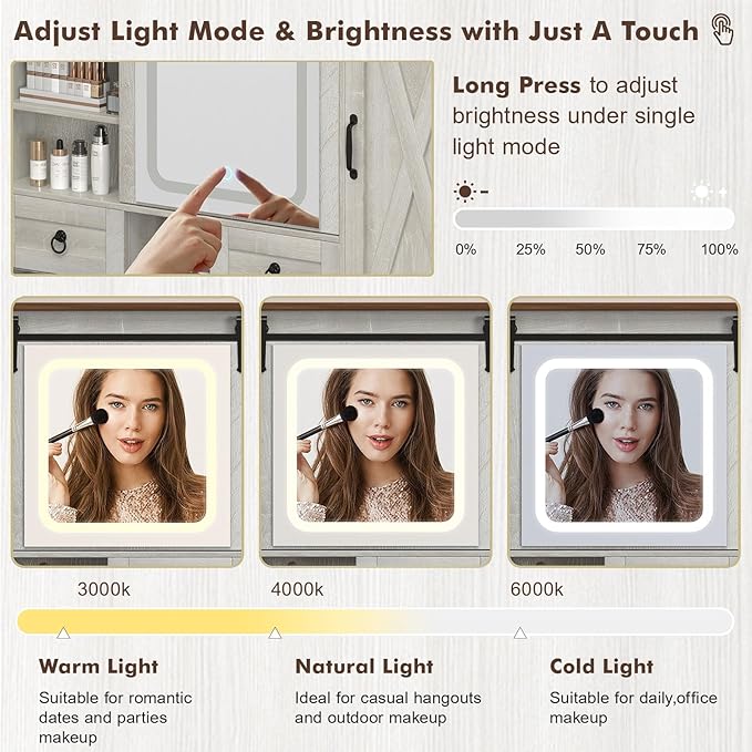 - CUSTOMIZE YOUR GLOW: Personalize your lighting experience by adjusting the brightness of the LED lights to create the perfect ambiance for flawless makeup application or grooming. Cold white light, warm yellow light, natural light, just a touch, can easily create the ideal atmosphere, whether you are going to work or a dinner party, or an outing