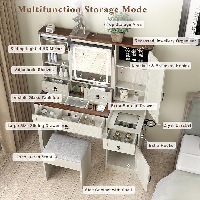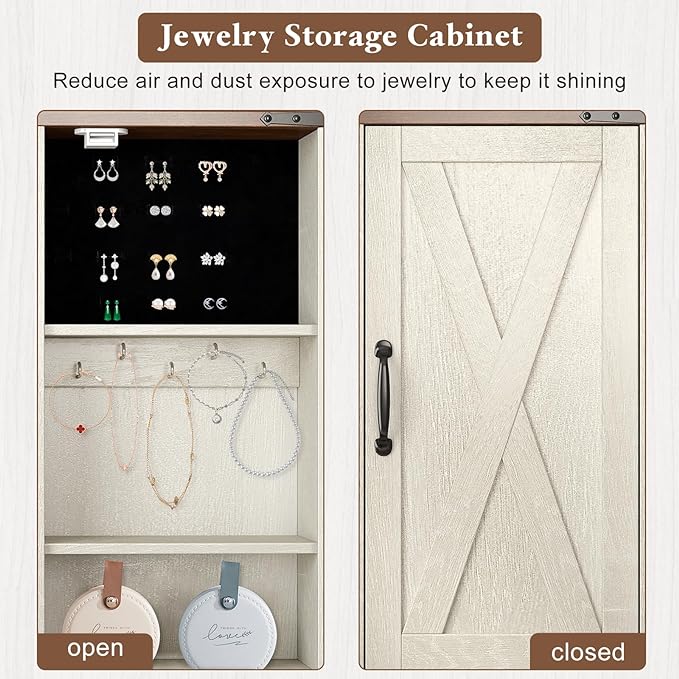 - JEWELRY STORAGE AREA: Effortlessly organize your jewelry with our compact vanity's specialized compartments for earrings and rings, plus a hanging area for bracelets and necklaces. Say goodbye to tangled messes and lost items - keep your favorite pieces beautifully displayed and easily accessible