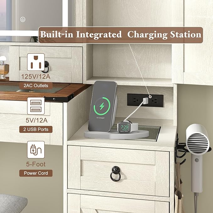 - OUTLET VANITY DESIGN: Experience a blend of elegance and functionality with this chic vanity mirror with lights and table set, complete with a built-in charging station, 2 standard AC outlets and 2 USB ports are ready for your devices. The hair dryer holder is set nearby to facilitate your use and storage of the hair dryer. Anyway, opt for both style and practicality in one stunning piece of farmhouse furniture