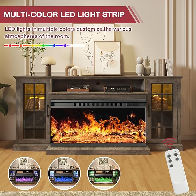 - 3-Side Glass Display Fireplace: 24 inch fireplace featuring 5 settings for flame brightness, 12 colors of backlight and 12 LED colors of light strips, Besides, it allows you to adjust the temperature from 65°F to 95°F and the time setting is from 0 to 6 hours