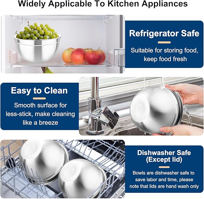 - Easy Clean & Dishwasher Safe - Bright mirror interior surface for easy food release and anti-fingerprint matte exterior for good stain protection, Easy to clean and looks like getting a new one after washing, The metal bowls are dishwasher safe to save labor, The plastic lids can only be washed by hand to avoid deforming