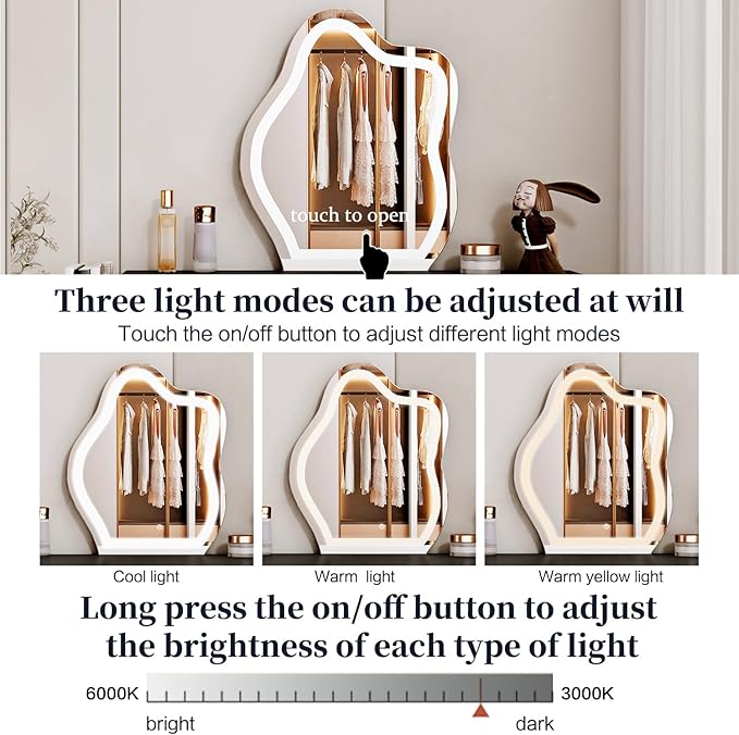 - 【3-Color LED Light】The vanity desk features a specially shaped dimmable lighting mirror with 3 different LED lighting colors, including natural, warm and cool light, for a variety of indoor lighting and environments to optimize your makeup
