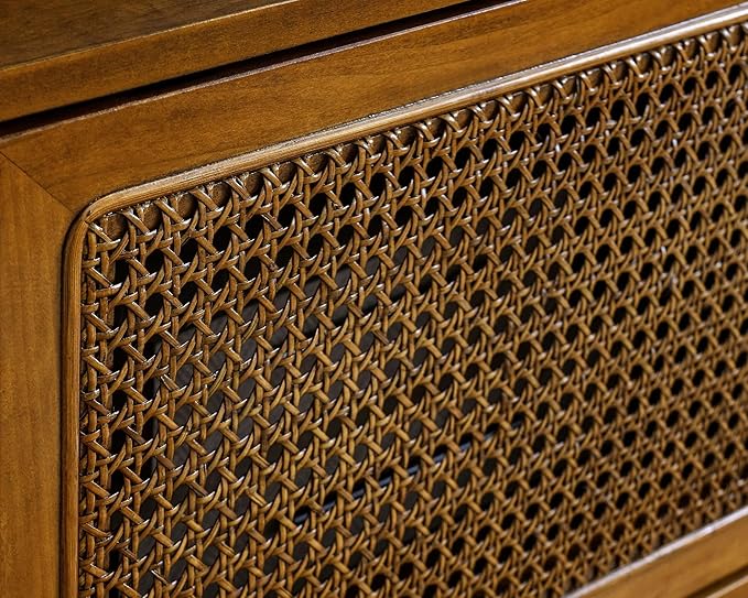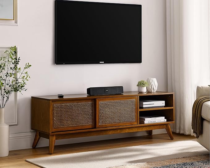 - 【Mid Century Modern TV Stand】This media console with storage blends modern and bohemian styles. Four solid wood legs provide strong support for our cane-made TV cabinet. In addition, plastic adjustable feet on the legs adjust the Angle to maintain balance and avoid scratching the floor.