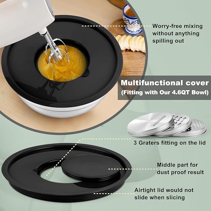 - 【Useful Largest Set with 3 Graters】Our largest lid have a 4.33-inch hole and a small fitting lid for dust-proof, Just mixing food easily with beater through the middle hole without splashing food everywhere, Also add ingredients quickly and help to save the hassle of opening cover repeatedly, 3 Different grater attachments are easy to cut food (slicing, grating and shredding) and then right into the bowl, Making your kitchen neat and be simple to prepare food before cooking