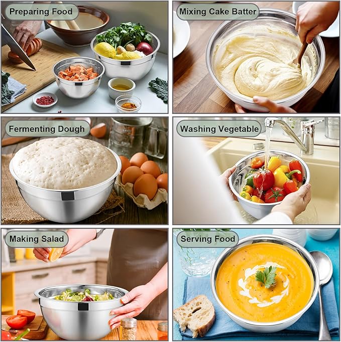 - 【Keep Food Fresh】Each mixing bowl come with well-matched lid, Could close snugly on the bowl to create an airtight storage container, Easy to keep your food fresh and dry, Suitable to store leftovers in refrigerator or store your leftover snacks, Also protect your food against dust and avoid the food leaking, Lightweight enough is convenient to transport on camping and picnic, 6 Different sizes could meet your storage requirements for multiple capacity