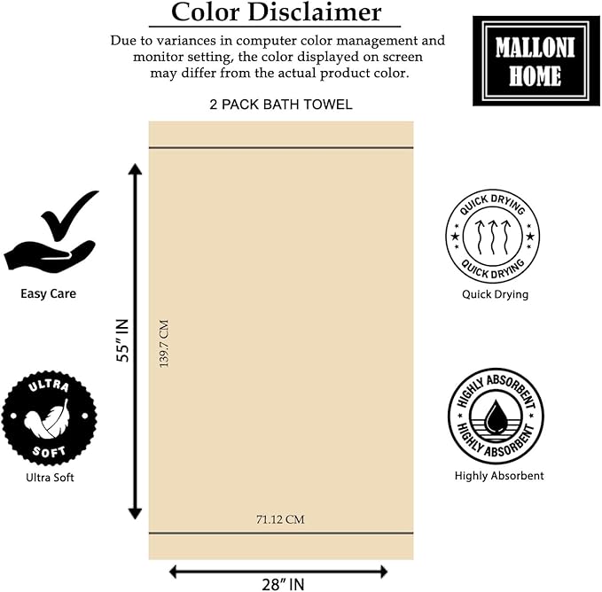 - Each set contains two (2) 100% pure cotton bath towels 28x55 inches