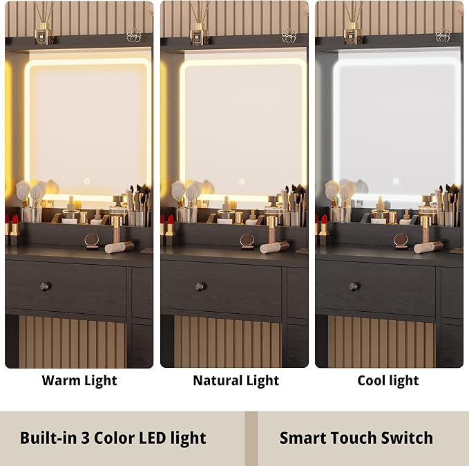- With LED light: This makeup table has an adjustable LED light strip and 3 light modes, you can adjust the brightness according to your makeup needs and create the best makeup every day.
