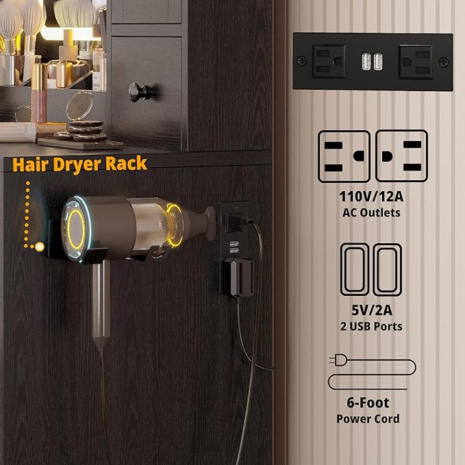 - With Charging Station: There is a built-in charging station in the side space, including 2 standard plug sockets and 2 USB ports, making it convenient to charge your devices and use beauty tools. Applying makeup becomes easier and more efficient.
