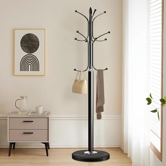 - [Stable & Sturdy]➤ This coat tree base is made of natural marble stone, the base measures 14.6 inches in diameter, which is enough to support about 130 pounds of weight, supporting the clothes to hang firmly without shaking.The whole coat rack frame is made of sturdy steel, adopt Painting and baking process, make a elegant appearance and a delicate touch. The main pole is supported by a 1.96" diameter steel pipe, it's with a stronger bearing capacity, more durable.