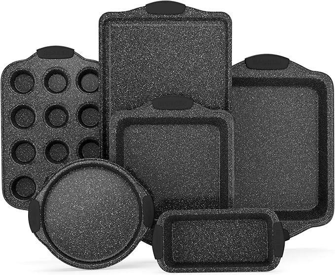 6-Piece Nonstick Gray Marble Coated Bakeware Set - Professional Quality Carbon Steel Pans with Silicone Handles - Ideal for Oven, Refrigerator, Freezer - Dishwasher Safe