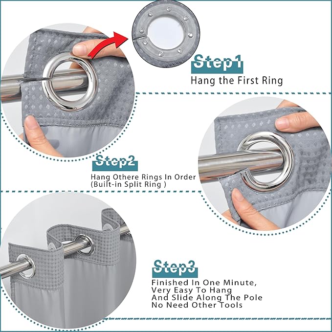 - SUPER EASY TO INSTALL : This shower curtain design with High Quality Flex On Rings that you can very easy to install it in one minute, smart design will made it easier to hang and slide along the pole.