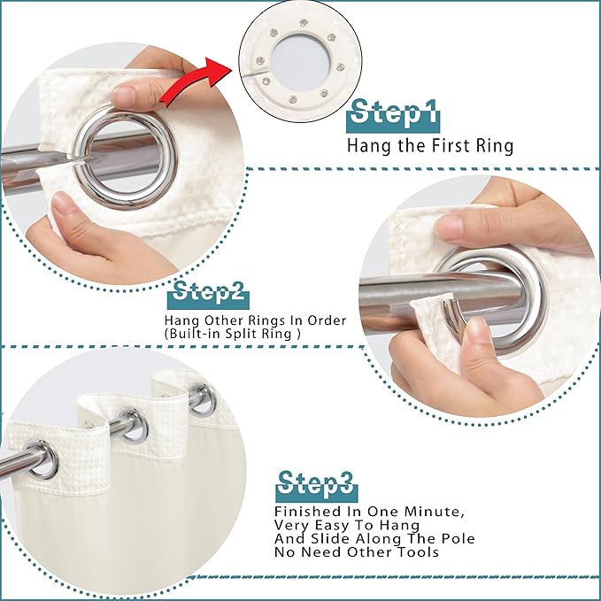- SUPER EASY TO INSTALL : This shower curtain design with High Quality Flex On Rings that you can very easy to install it in one minute, smart design will made it easier to hang and slide along the pole.